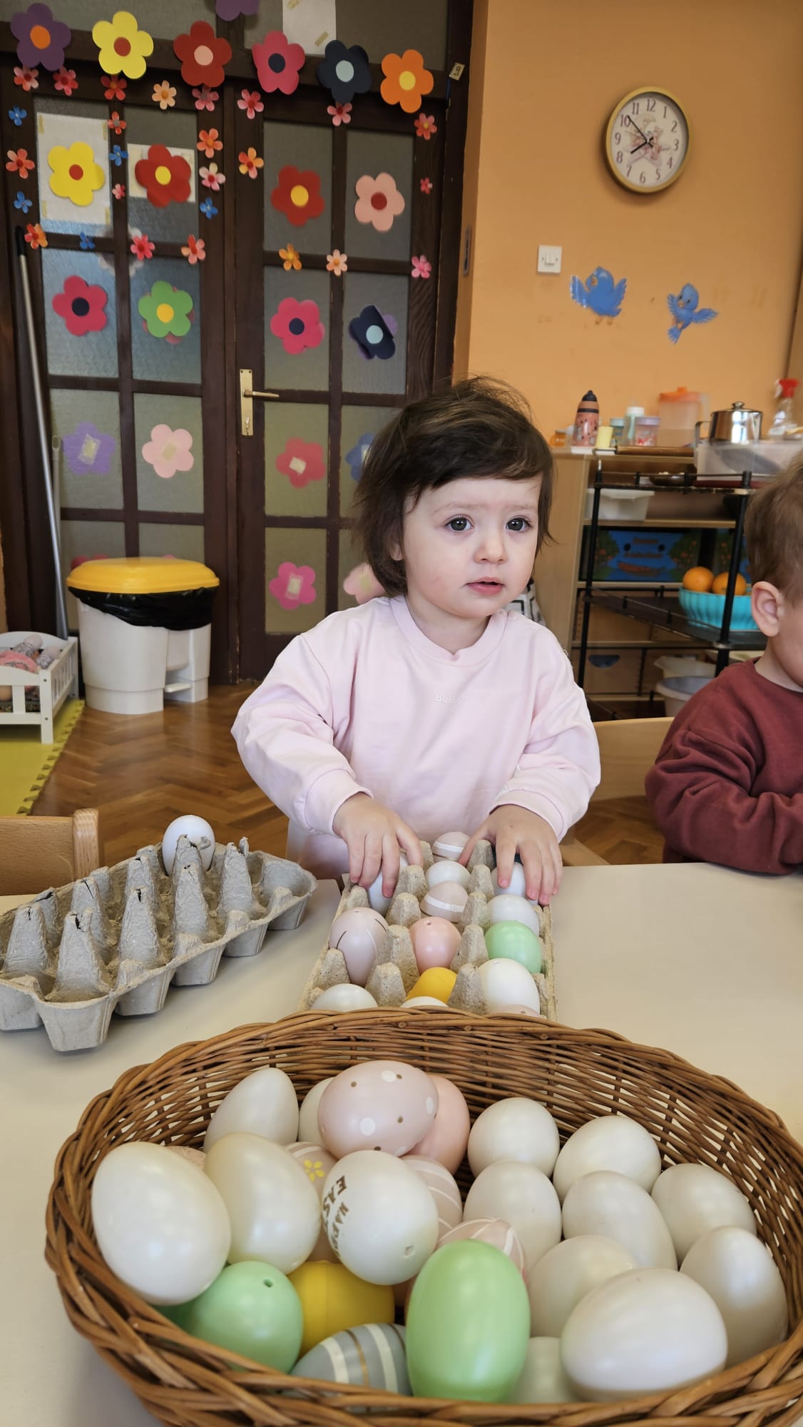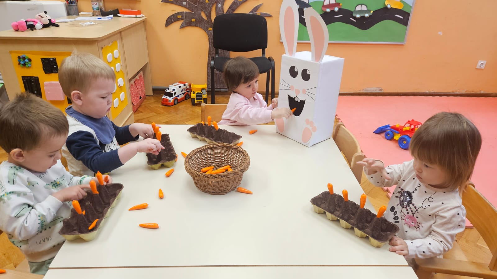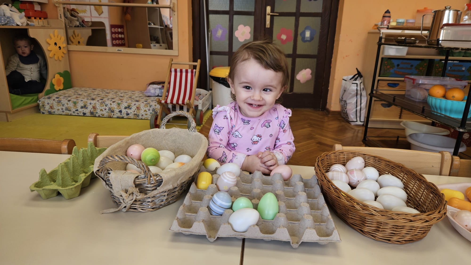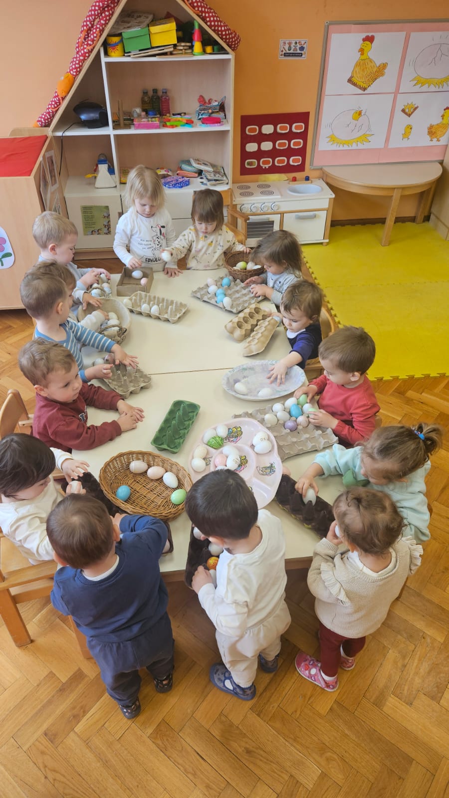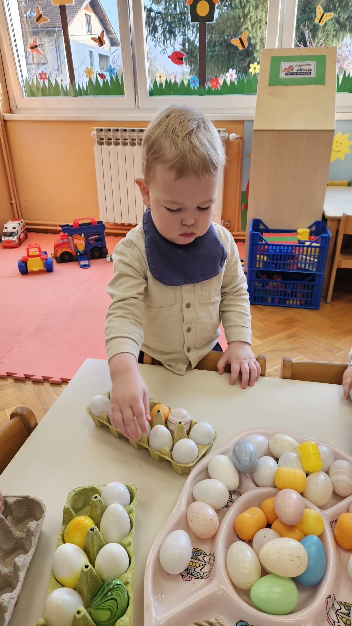 U našim jaslicama vlada pravo uskrsno veselje. Kroz igru, istraživanje i kreativne aktivnosti upoznajemo čari blagdana Uskrsa. Djeca su s veseljem sudjelovala u ponuđenim aktivnostima, manipulirala su plastičnim jajima slagajući ih u košare i prikladnu ambalažu, također su hranili uskršnje zeke, koka je nosila jaja a sadili su i mrkvice za zeke. Djeca su uživala slušajući priču "Koka i jaje" te razne pjesmice i brojalice. Naše uskrsne aktivnosti poticale su razvoj fine motorike, osjetilnog istraživanja i zajedničke igre, a najvažnije od svega ispunile su našu skupinu radošću i toplinom.
