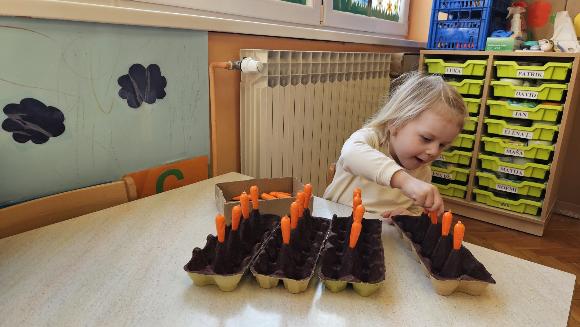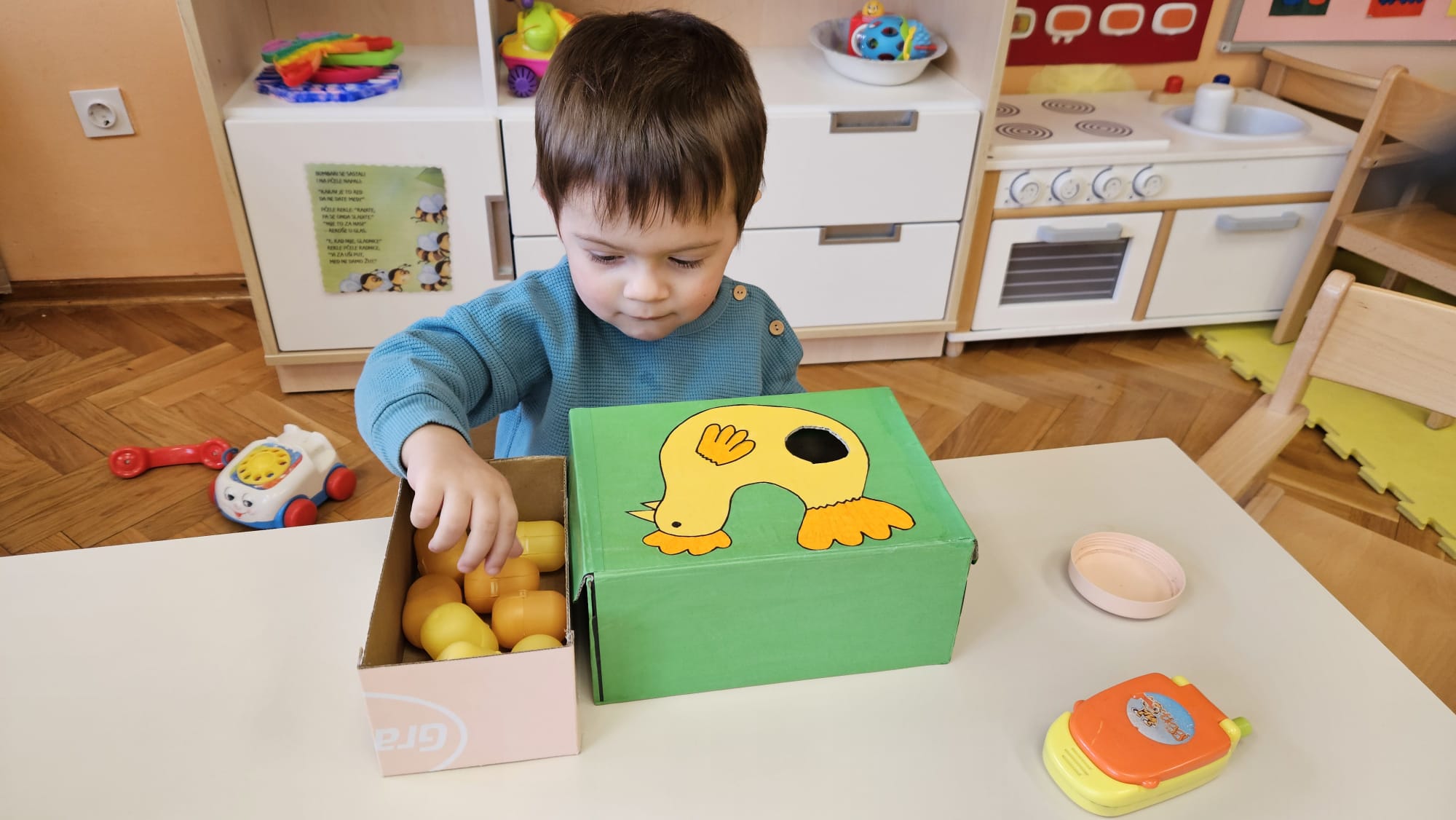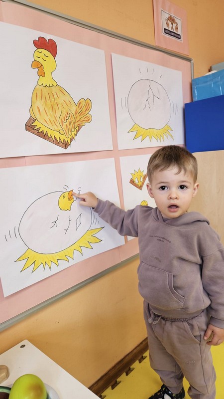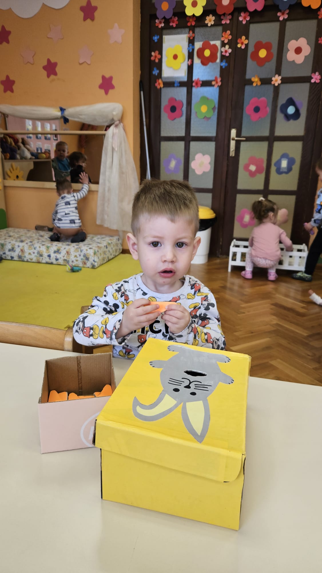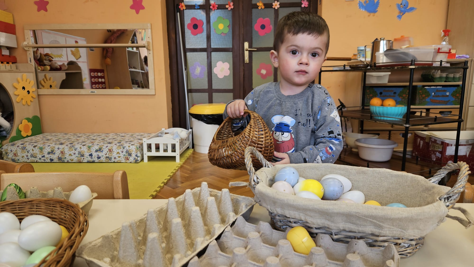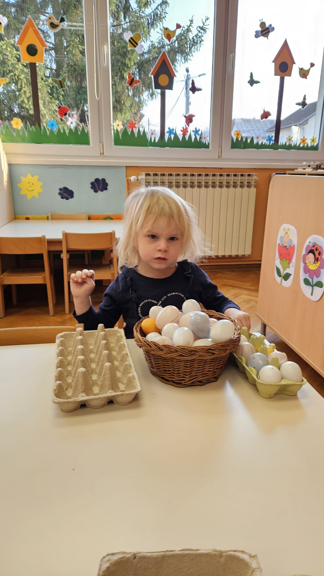 U našim jaslicama vlada pravo uskrsno veselje. Kroz igru, istraživanje i kreativne aktivnosti upoznajemo čari blagdana Uskrsa. Djeca su s veseljem sudjelovala u ponuđenim aktivnostima, manipulirala su plastičnim jajima slagajući ih u košare i prikladnu ambalažu, također su hranili uskršnje zeke, koka je nosila jaja a sadili su i mrkvice za zeke. Djeca su uživala slušajući priču "Koka i jaje" te razne pjesmice i brojalice. Naše uskrsne aktivnosti poticale su razvoj fine motorike, osjetilnog istraživanja i zajedničke igre, a najvažnije od svega ispunile su našu skupinu radošću i toplinom.
