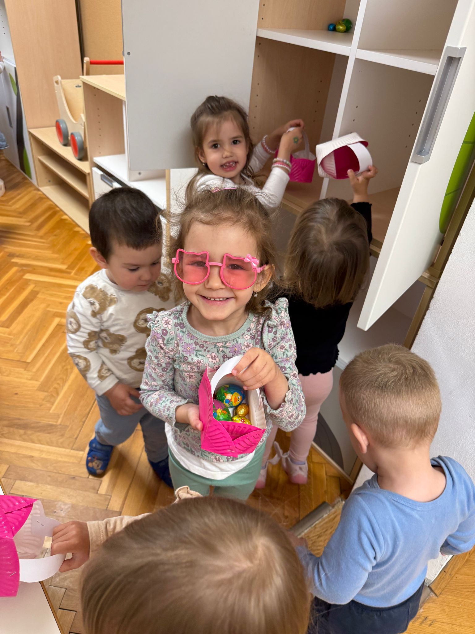U jasličkoj skupini Pužići 1. travnja je protekao u veselom duhu, uz lov na pisanice u pratnji odgojiteljica Gordane i Blaženke. Iako nas je kišno i tmurno vrijeme malo iznenadilo i pokušalo pokvariti planove, brzo smo se snašli i prilagodili – dobra zabava nije izostala! Djeca su s velikim uzbuđenjem tražila skrivene pisanice, a najuspješnija je bila Tea koja je pronašla čak 8 pisanica i time odnijela pobjedu. Bravo za našu malu pobjednicu! Kako bismo izbjegli razočaranje i nesuglasice među djecom koja nisu uspjela pronaći nijednu pisanicu, sve pronađene pisanice smo na kraju skupili na jednu hrpu i ravnomjerno podijelili. Tako je svako dijete dobilo po tri pisanice, a najvažnije od svega – svi su kući otišli s osmijehom na licu.