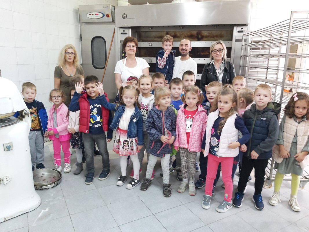 Dana 2.10.2019. skupina ''Medvjedići'' zajedno sa svojim odgojiteljicama Dragicom Abramović i Vesnom Števinović posjetila je pekarnu ''Pane Di Vita'' vezano uz sklop aktivnosti za realizaciju manifestacije ''Dani kruha i Dani zahvalnosti za plodove zemlje'' čiji su i nosioci. Domaćini su djecu i odgojitelje upoznali sa cijelim procesom nastanka raznih tijesta za kruh, peciva, razne slane i slatke slastice, te strojevima, pomagalima i pećima u kojima se peku svi ti pekarski proizvodi. Mnoštvom maštovitih pitanja i dječjih komentara završili smo druženje sa djelatnicima pekarne i zahvalili im na srdačnoj i domaćinskoj dobrodošlici.